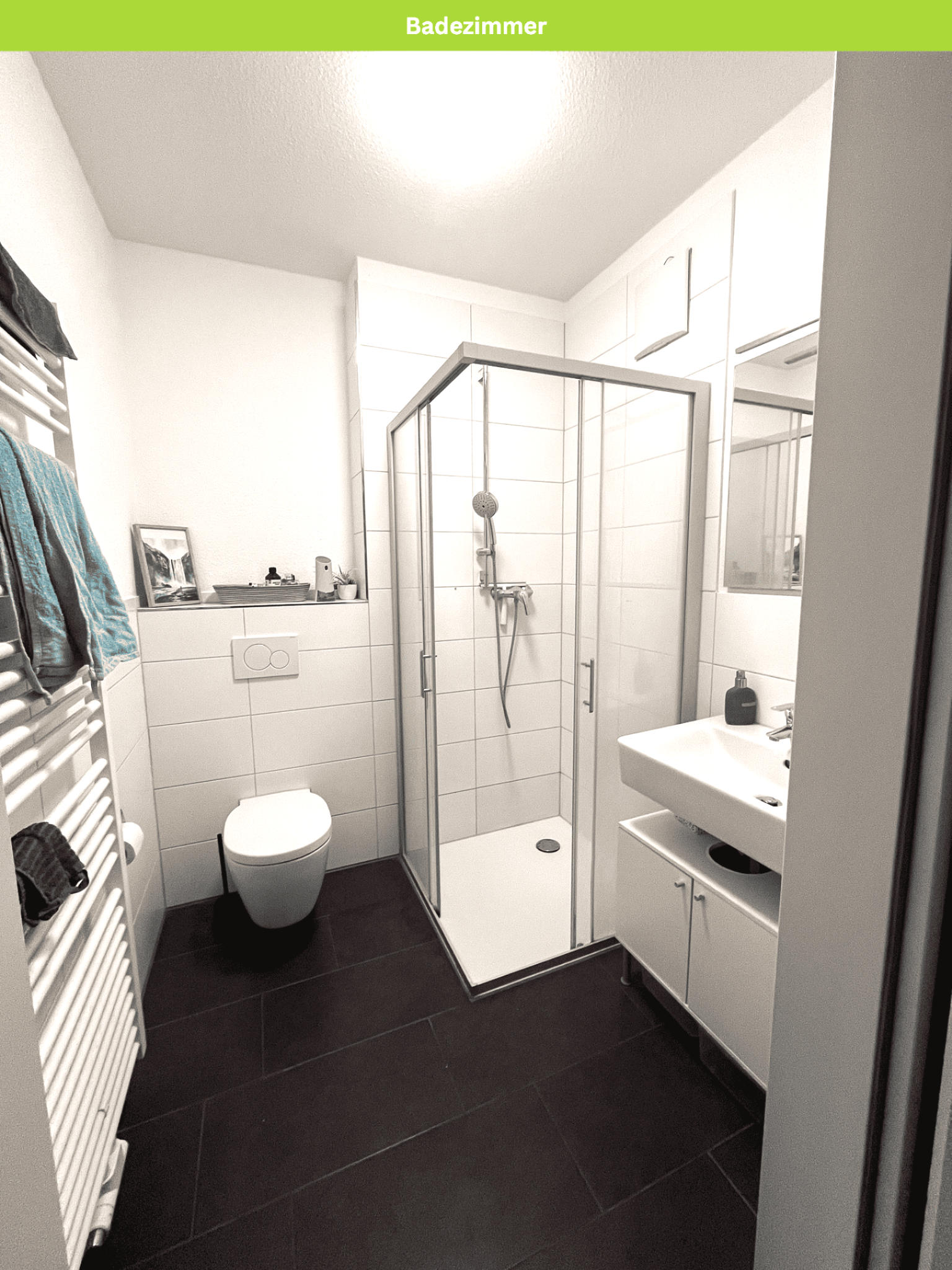 Das modern gestaltete Bad mit Dusche und Duschabtrennung/ Duschkabine.